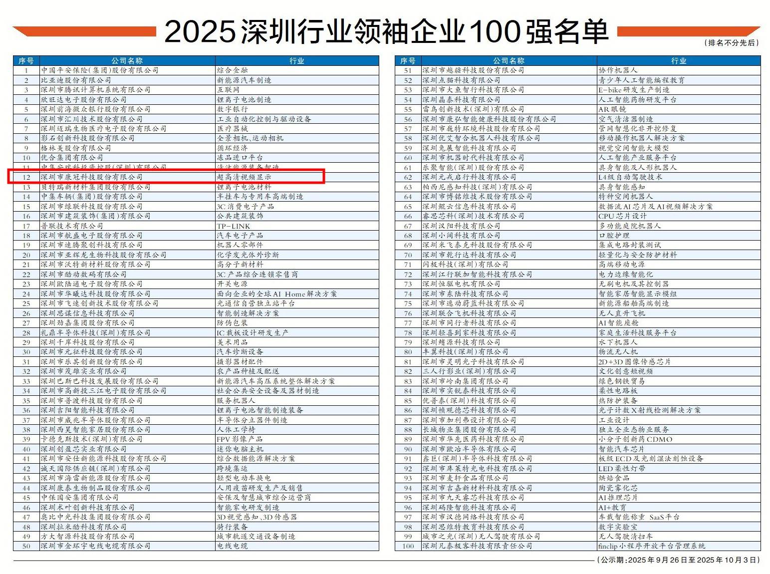 10月上旬,由深圳市工商业联合会(总商会)、深圳报业集团指导,深圳市行业领袖企业发展促进会与深圳商报/读创客户端共同主办的“2025深圳行业领袖企业100强”评选结果出炉。康冠科技成功入选该榜单。