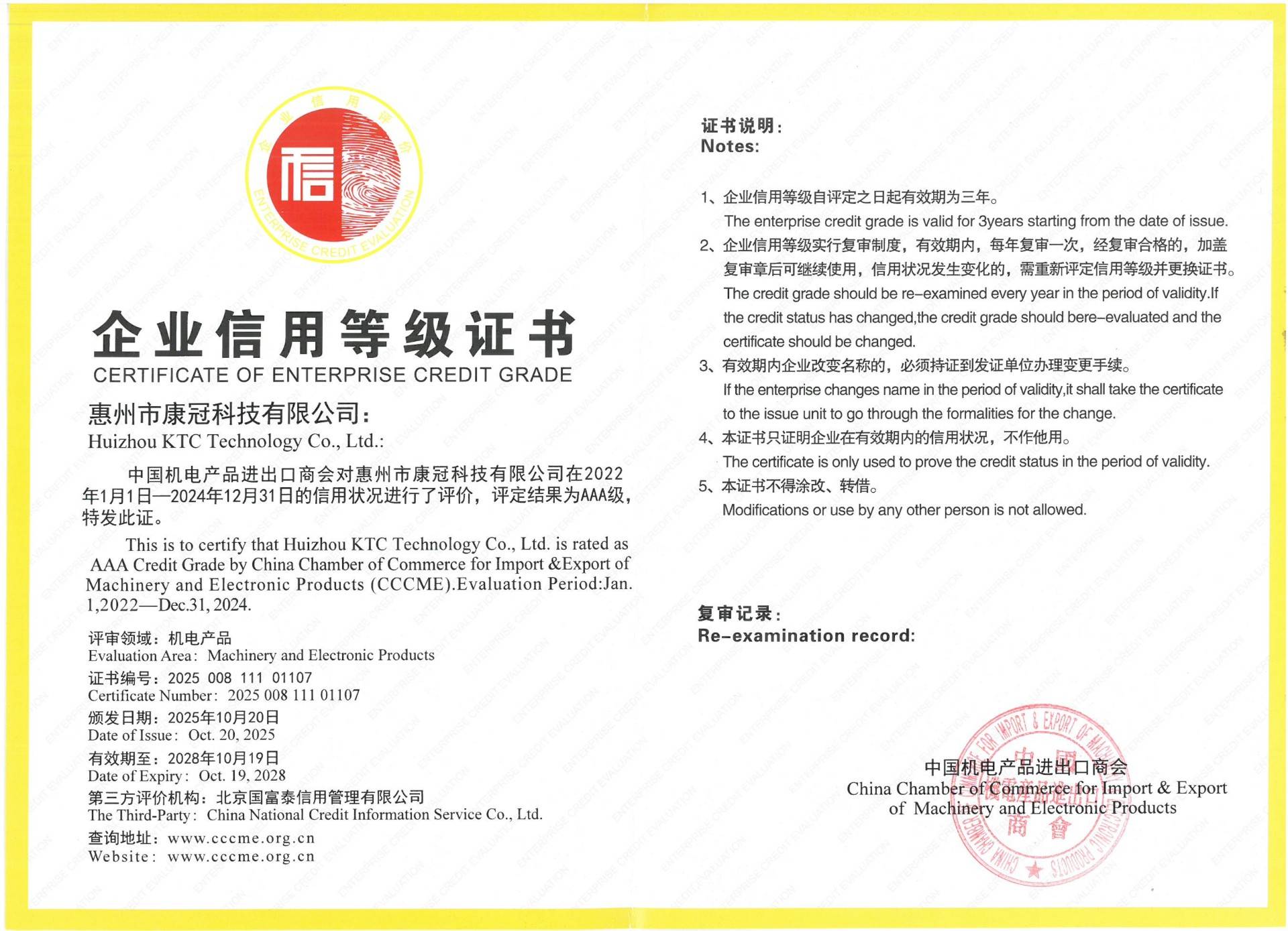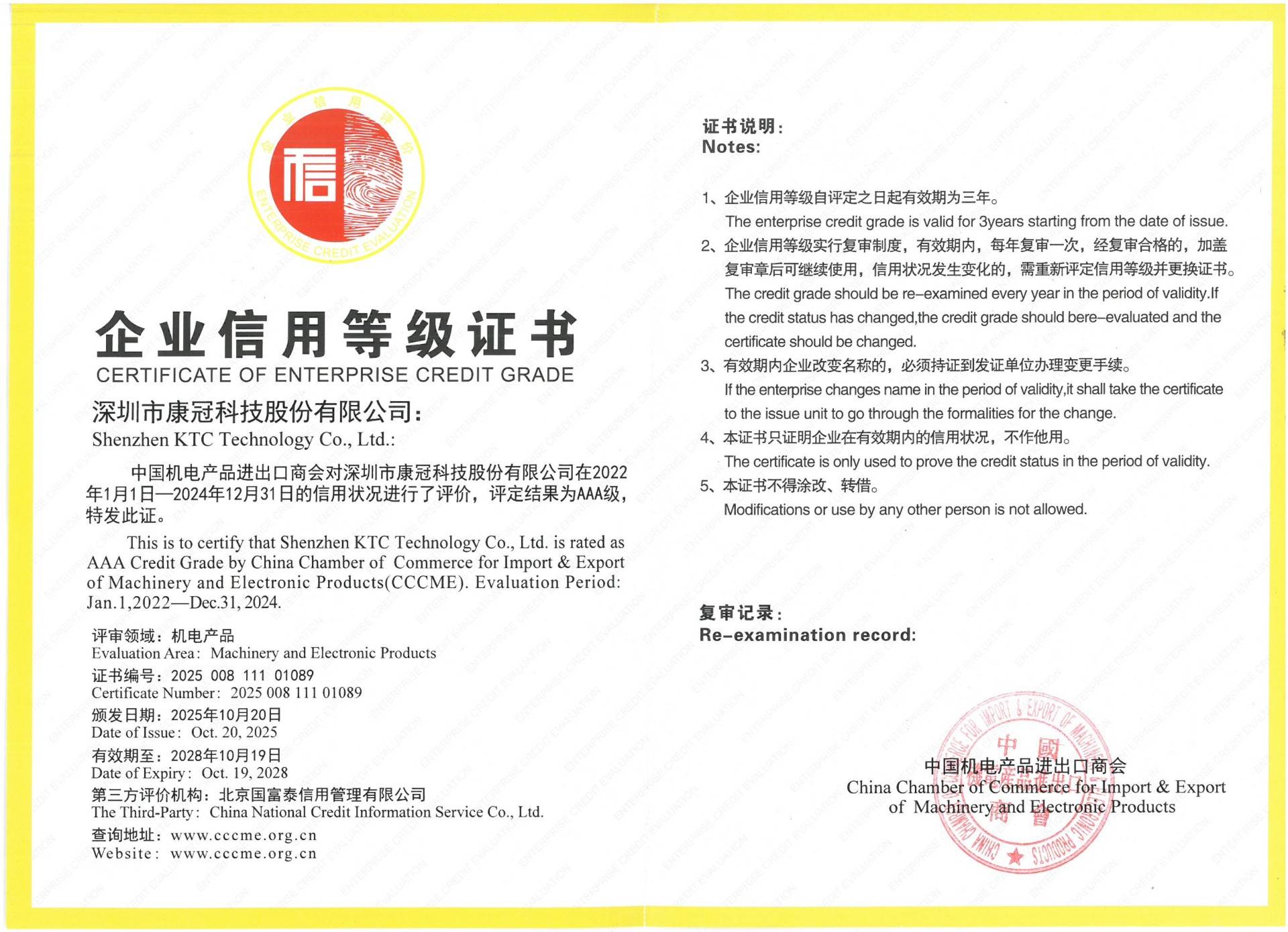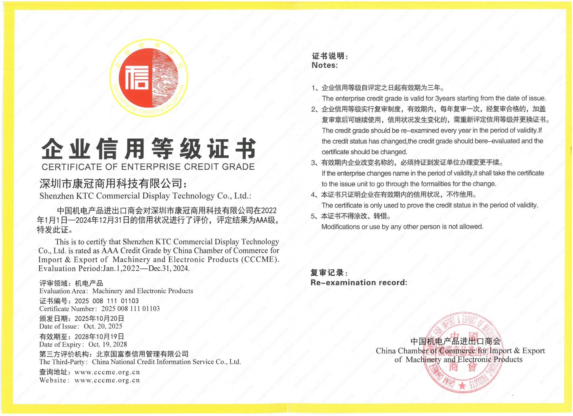 10月下旬,深圳市康冠科技股份有限公司及其全资子公司深圳市康冠商用科技有限公司、惠州市康冠科技有限公司成功获得中国机电产品进出口商会(以下简称“机电商会”)颁发的AAA级企业信用等级评价。
